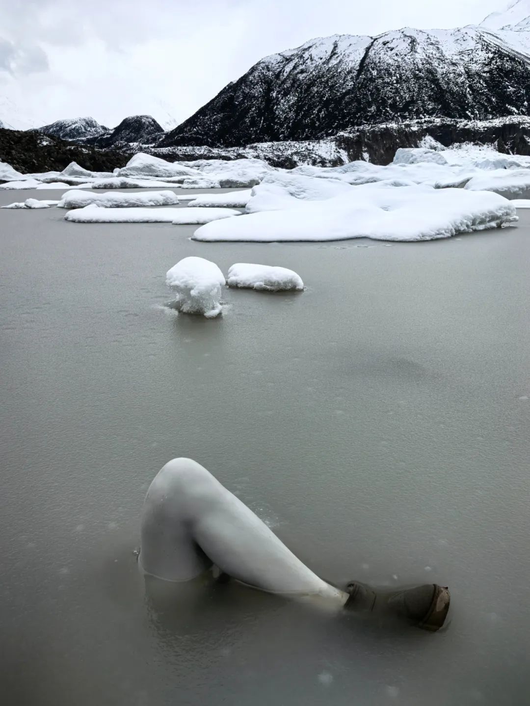 “蛙叔”近日和一又友们开车来到来古冰川,29日到了一个比拟偏僻的冰湖。他念念找个比好的角度拍照,走到了冰湖岸边,显著发现冰湖里闪现一条“东谈主腿”,脚上还穿戴雪地靴。