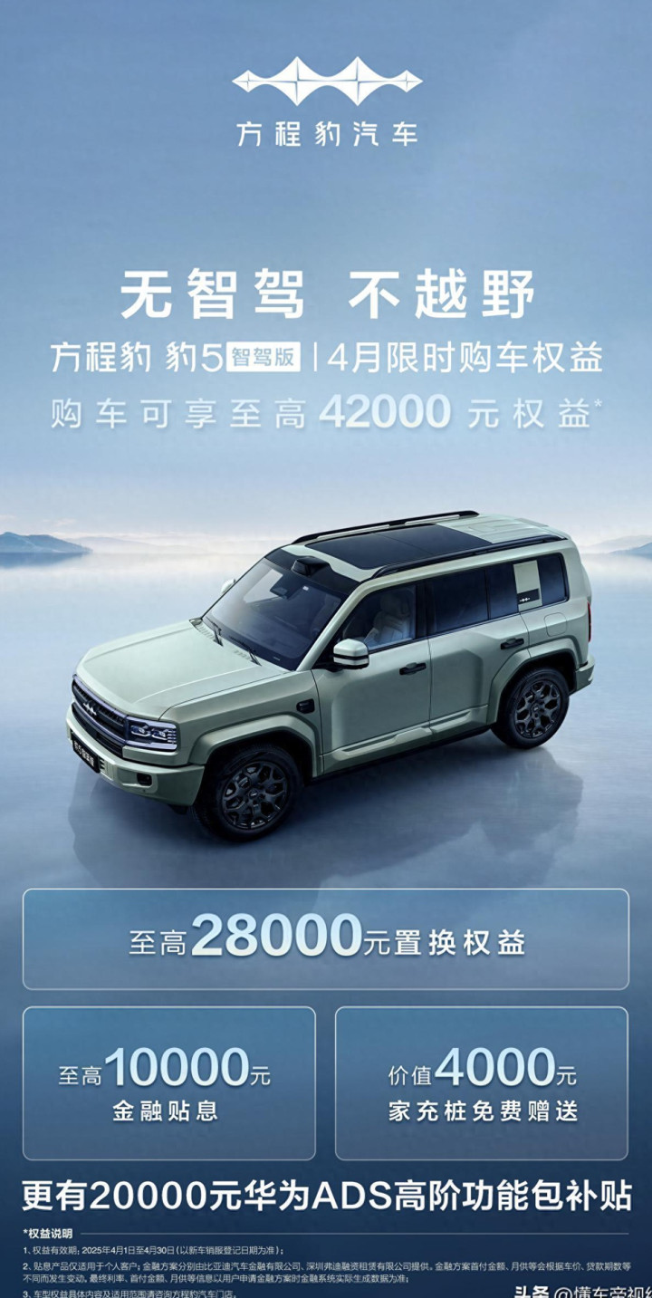 咱先说说豹5智驾版。这豹5智驾版啊,2月21日就上市了,官方开采价在23.98万 - 32.98万元之间。这车子在4月购车权力里,如果买智驾版的,置换权力这块可不得了,至高能有2.8万元呢,其中国度补贴2万元,品牌再补贴8000元。同期呢,还有至高1万元的金融贴息,何况啊,家充桩免费辅助,这充电桩价值4000元呢。淌若买乾崑智驾版车型,还能再赢得2万元华为ADS高阶功能包补贴。这就好比去菜市集买菜,商家不仅给您低廉,还送您个小礼品似的。
