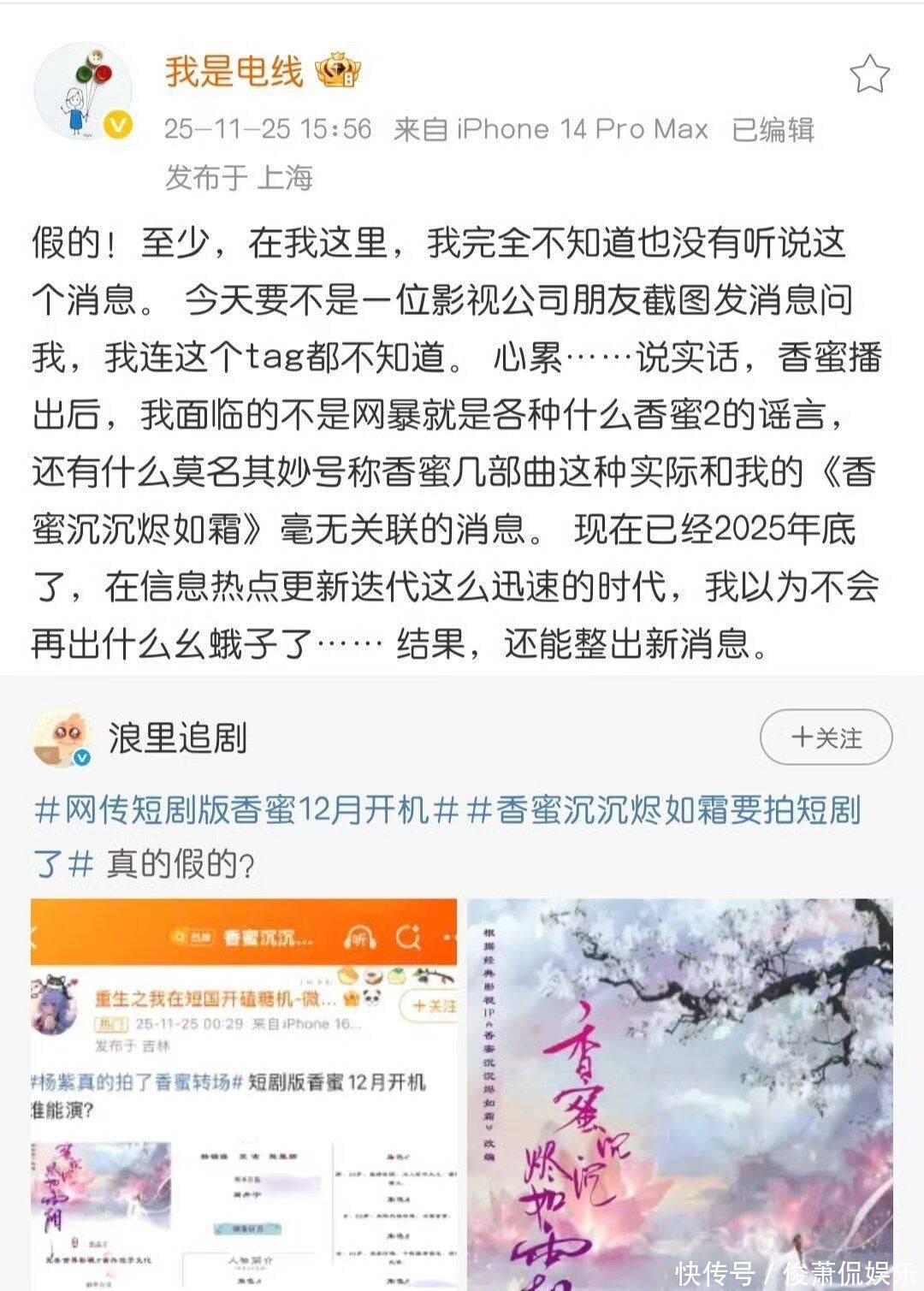 最大争议是原着演义作家「电线」日前才在网路上公开否定翻拍短剧的传闻,直言此事「假的!至少,在我这里,我豪阔不知说念也莫得传说这个音讯」,更示意我方看到音讯时亦然稀里糊涂,甚而连联系tag王人没听过,并为此感到心累。作家与制作主说念主说法不一,让这部备受关爱的重启之作,尚未开拍就先堕入版权罗生门。