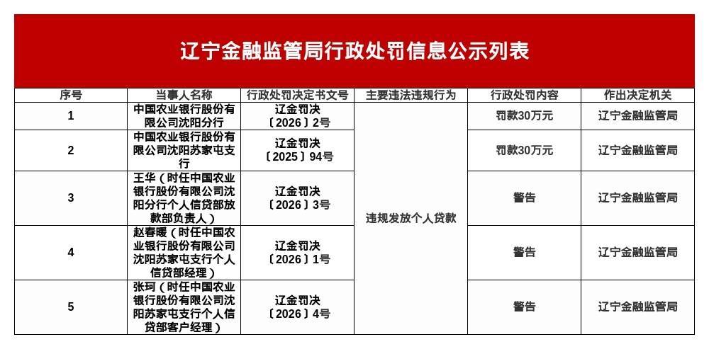 中国农业银行股份有限公司沈阳苏家屯支行也因违纪披发个东说念主贷款,被罚金30万元。