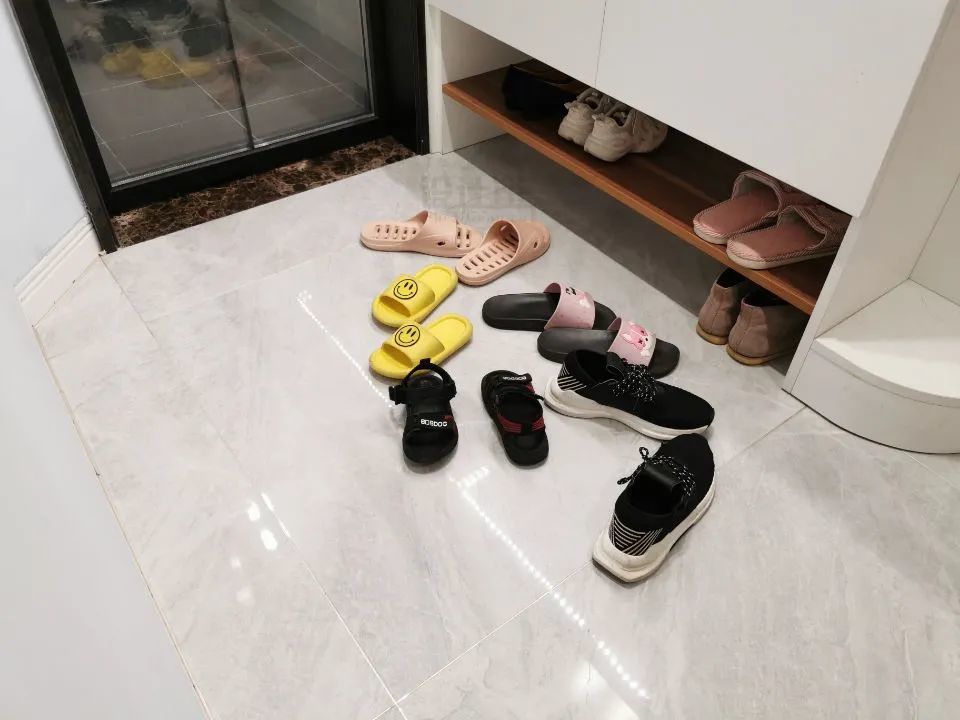 ⑦大地务必平整安全:好多网编推选“下千里式玄关”,说能挡住灰尘,骨子用起来全是坑:下千里处容易积灰,尤其是上下差的阴角位置,清洁起来相等云尔;老东谈主和孩子走路时,也很容易被台阶绊倒。