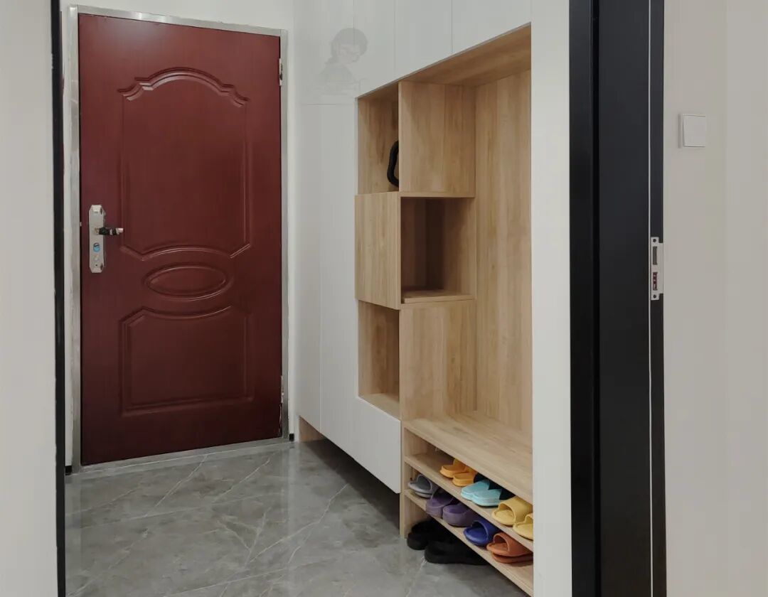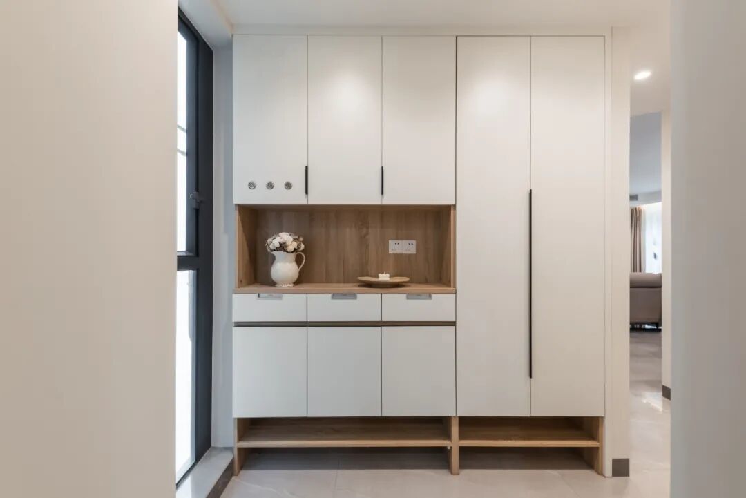 ②鞋柜底部必留空:这是最实用的缠绵莫得之一!鞋柜底部留空15-20cm,用于收纳常用拖鞋,进门脱鞋后胜利踢进去,拖鞋申脚就能穿上,无需弯腰拿鞋,相等便捷。何况还保管玄关整洁,幸免满地鞋子的情况。