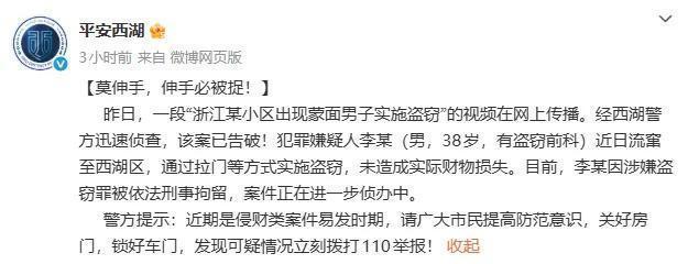 12月27日上昼,杭州市公安局西湖分离局发布通报称,经西湖警方迅速视察,该案已告破。犯科嫌疑东谈主李某(男,38岁,有盗窃前科)近日流窜至西湖区,通过拉门等神志实行盗窃,未酿成实质财物耗损。
